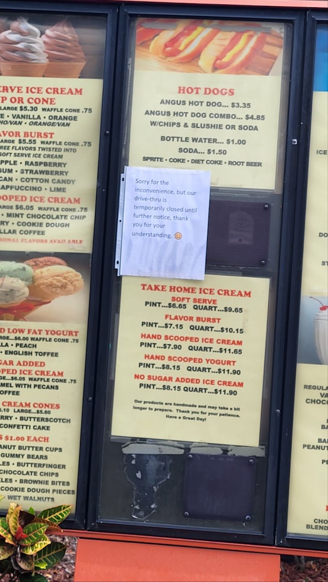 Visitors often come by to enjoy these sweet options during warm afternoons or as a relaxing evening treat, whether sitting at the outdoor seating area or grabbing a quick order from the drive-thru. Alongside ice cream, simple hot dog combos add a satisfying savory choice, making this a well-rounded spot for light, approachable meals and refreshing desserts.